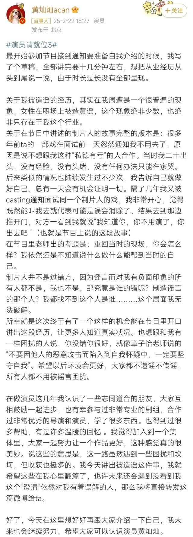 随即她又透露,自己20岁出头的时候经历过一场面试,制片人坐在面试间翻看资料,当她提到自己叫“黄灿灿”时, “制片人抬起头看了我一眼,‘哦,我知道,你不用演了,你出去吧!’” 随后 #黄灿灿曾因被造黄谣失去工作#等话题 登上热搜 2月22日晚 黄灿灿发长文回应传言 相关词条随即登上热搜第一